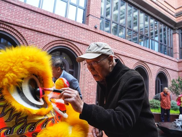 作为静安社区书画社的社长,95岁的李鼎良爷爷被请到醒狮正前方。他站定身形,手握蘸了朱砂的毛笔缓缓抬起手,为醒狮点睛:“一点左眼,增寿延年;二点右眼,岁岁长安。”李爷爷手里的毛笔刚落下,大伙儿就鼓起掌来,拿起手机拍照。