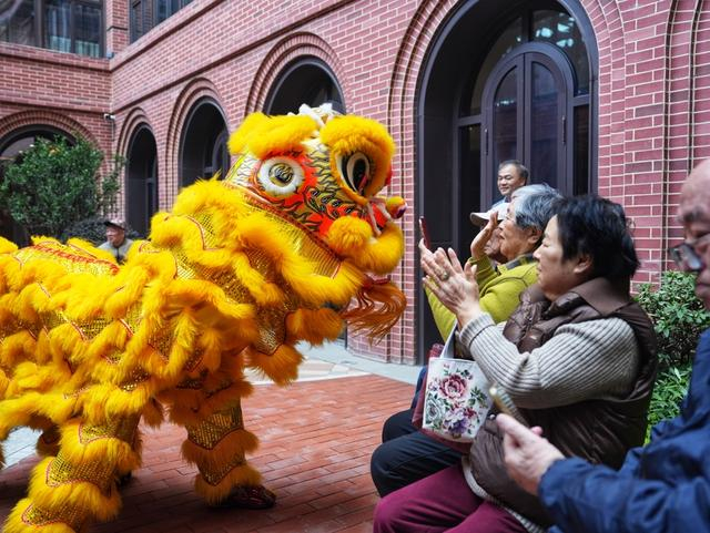 清晨九点半,舞狮的鼓点在太保家园静安社区中庭响起。今天(2月15日)是上海的小年夜,金红相间的醒狮昂首腾跃,锣鼓铿锵。听到动静,老人们纷纷从房门探出身子,有的披着外套就往中庭赶,还有人举着手机录像,“待会我要发给女儿看!”