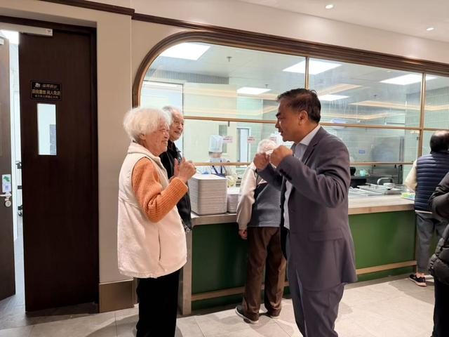 太保家园静安社区总经理陶永忠在食堂迎接老人。