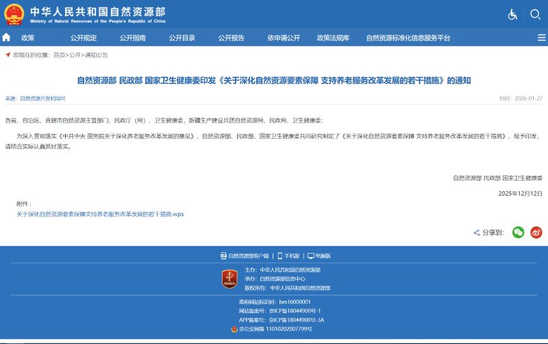 1月27日,自然资源部、民政部和国家卫生健康委印发《关于深化自然资源要素保障支持养老服务改革发展的若干措施》。